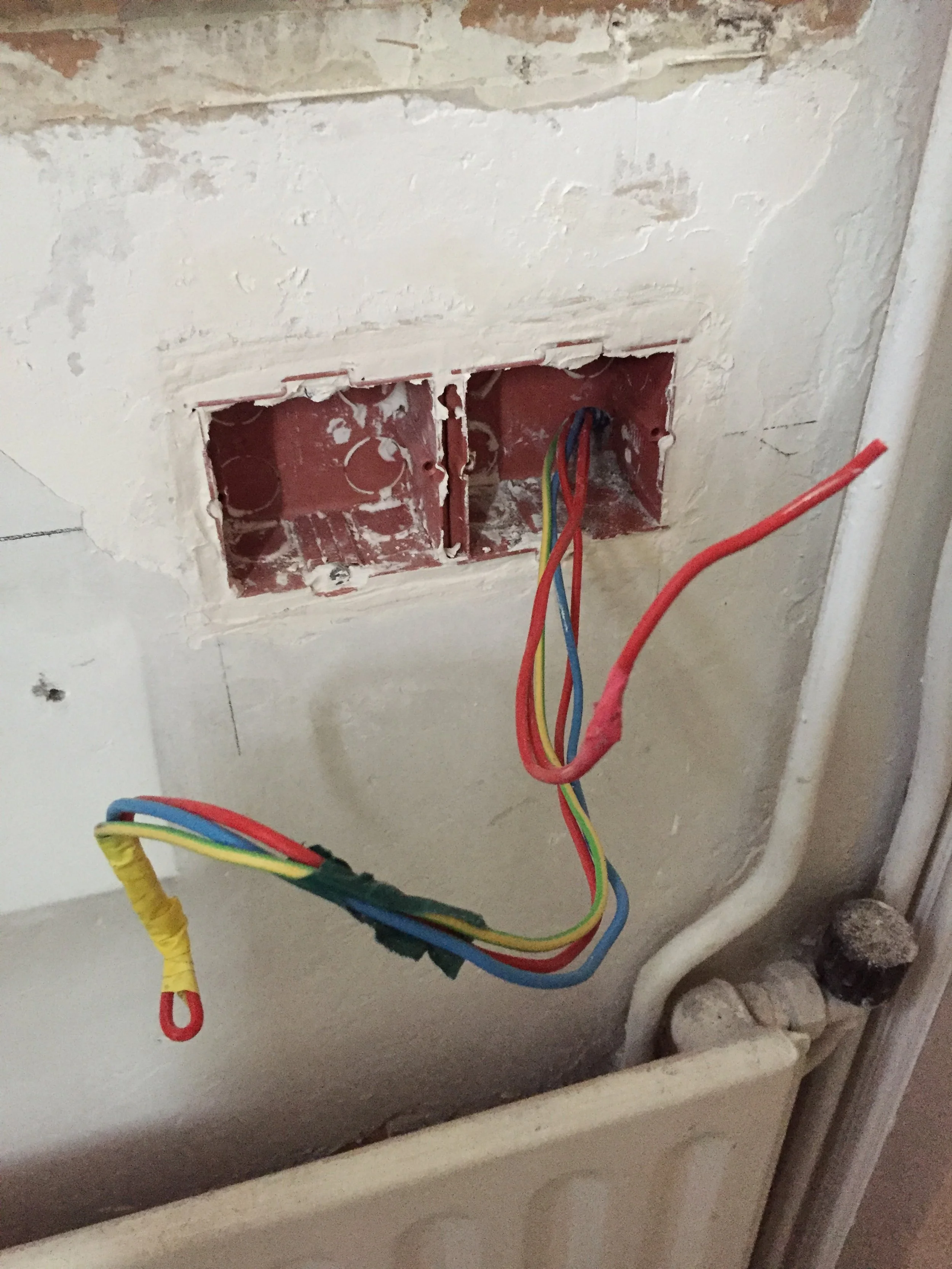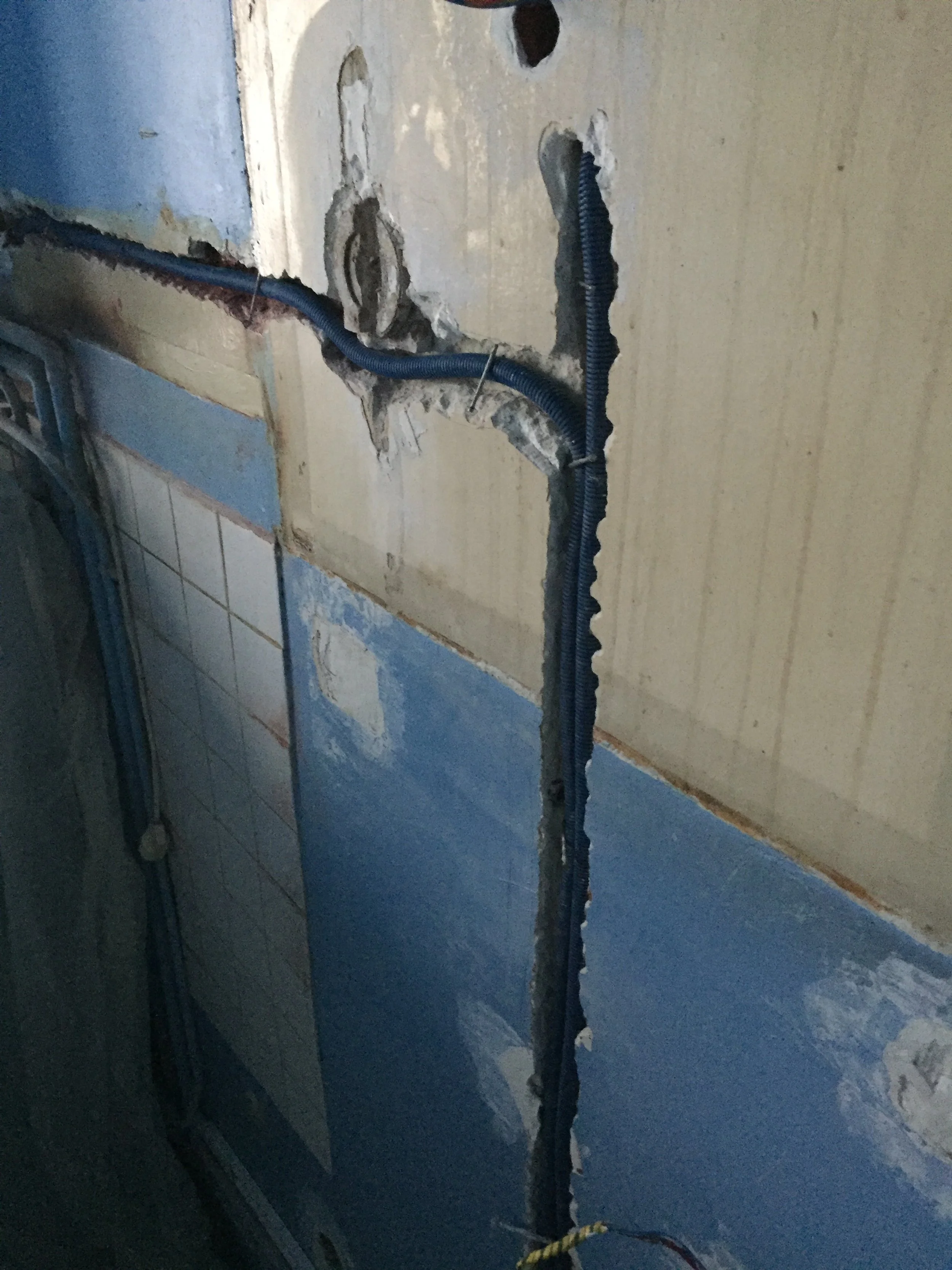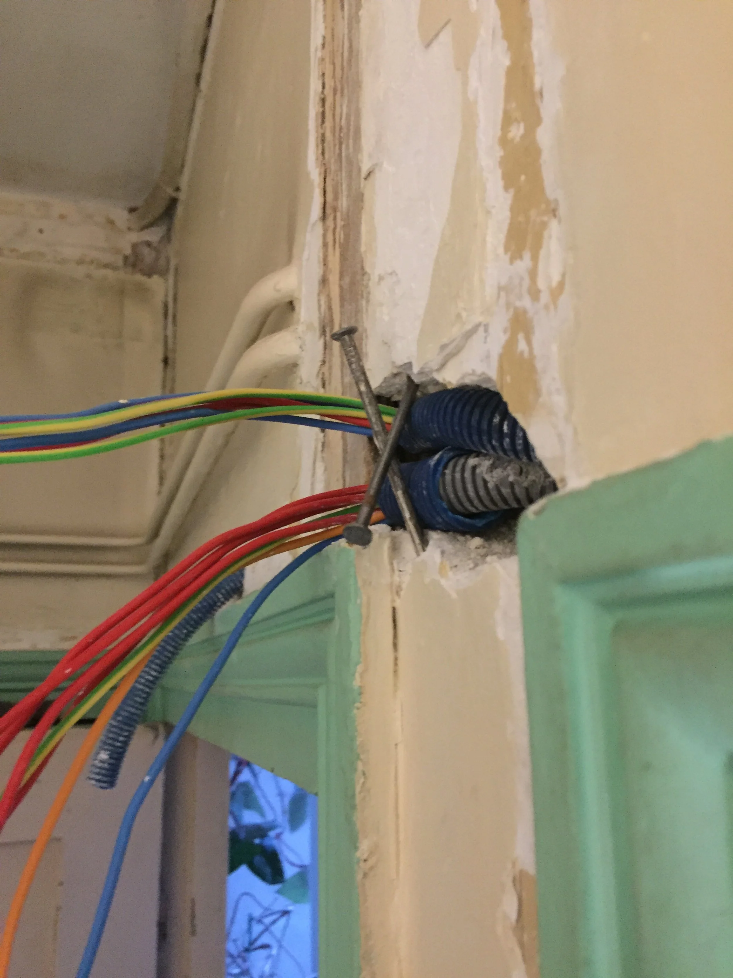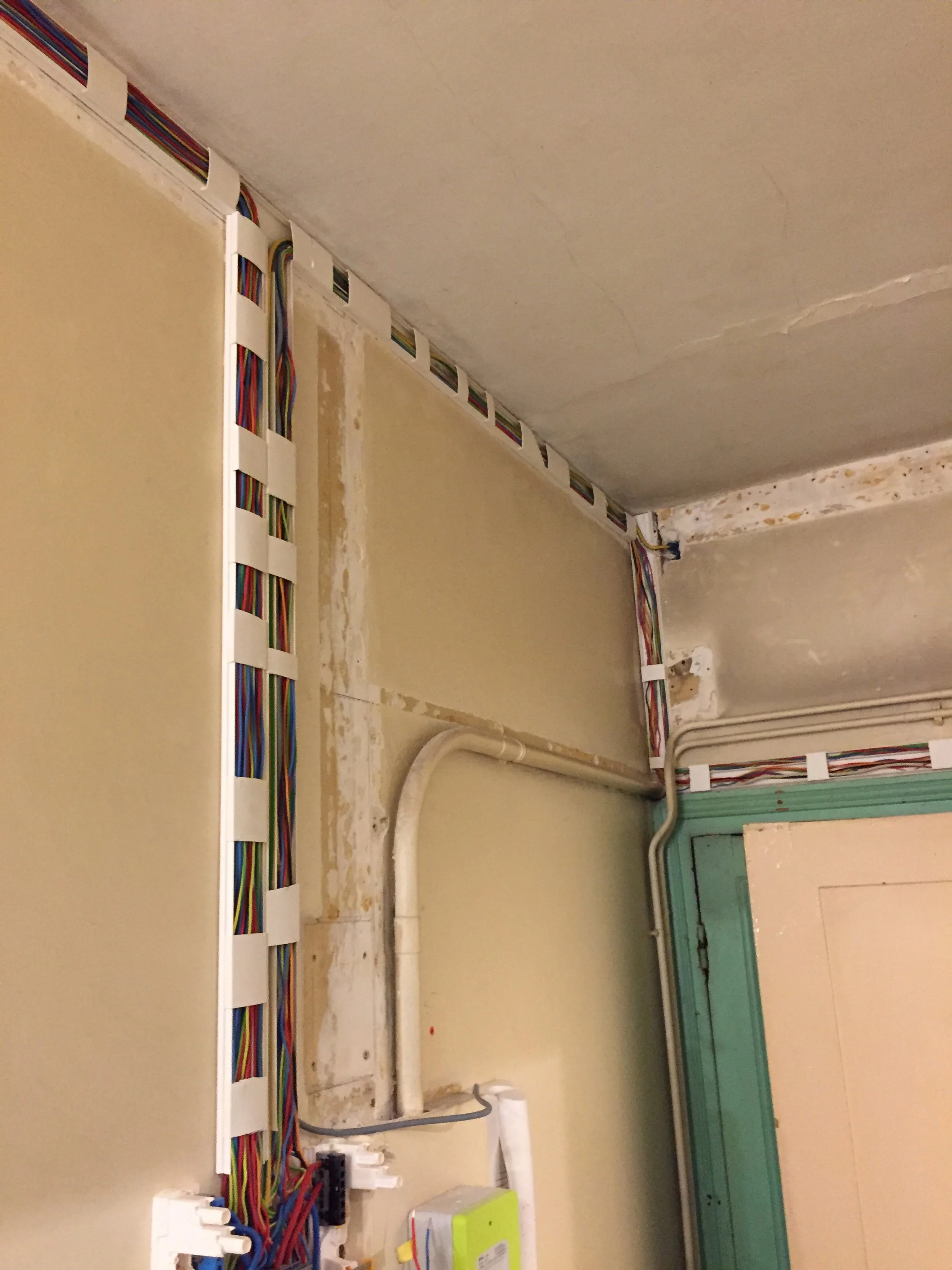 Circuits acheminés en gaine dans une cloison en placo et encastrés dans un mur en plâtre, mars 2025