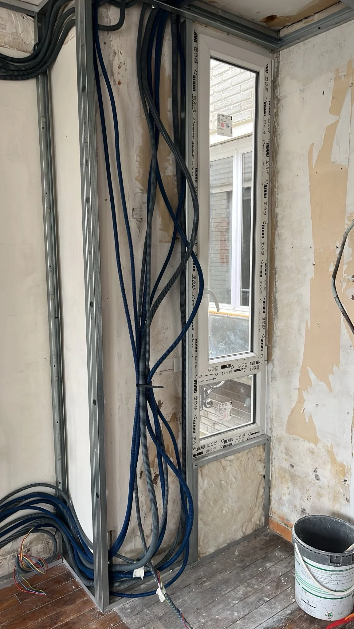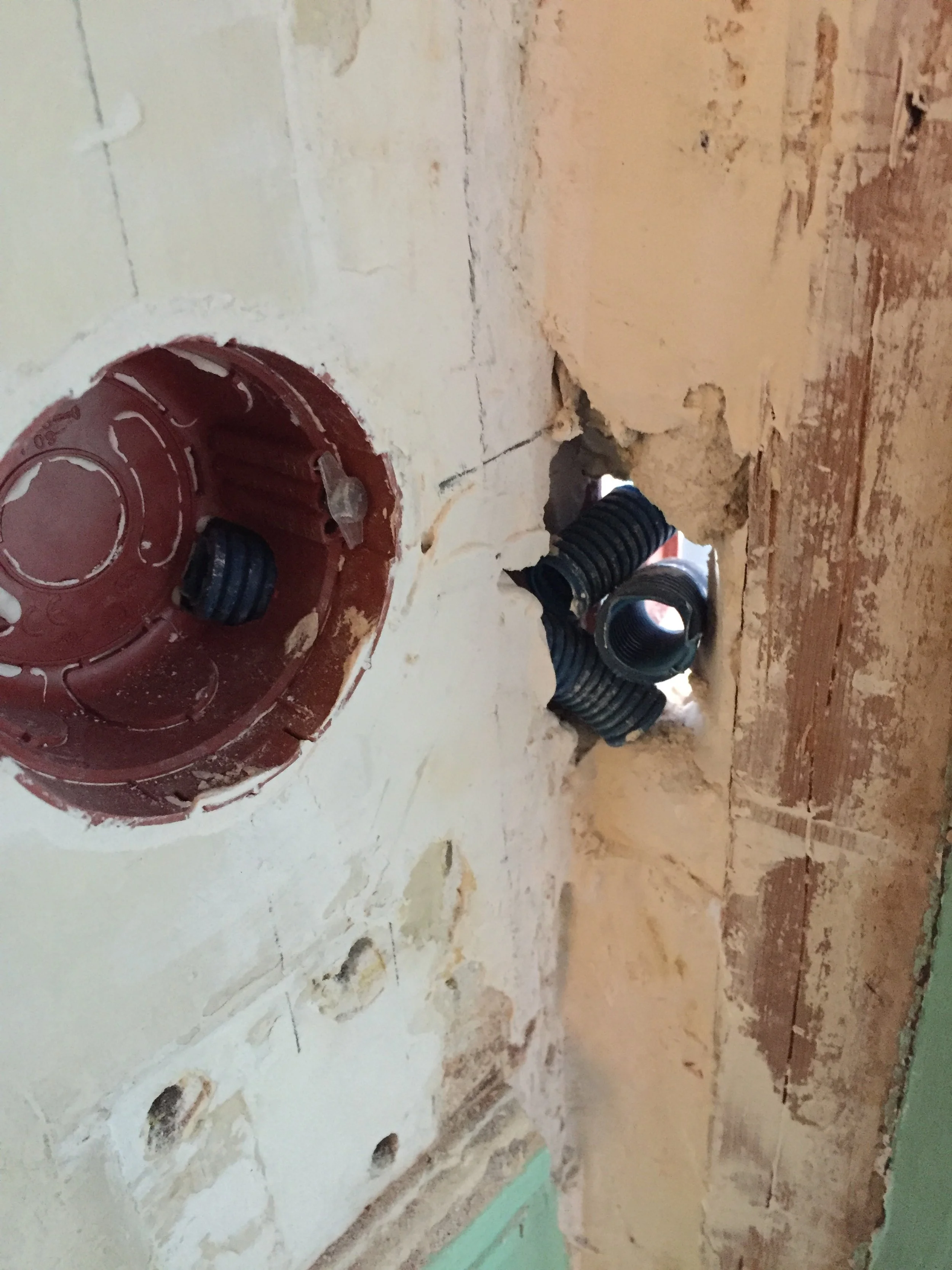 Encastrement de gaines dans une cloison en plâtre, juin 2025
