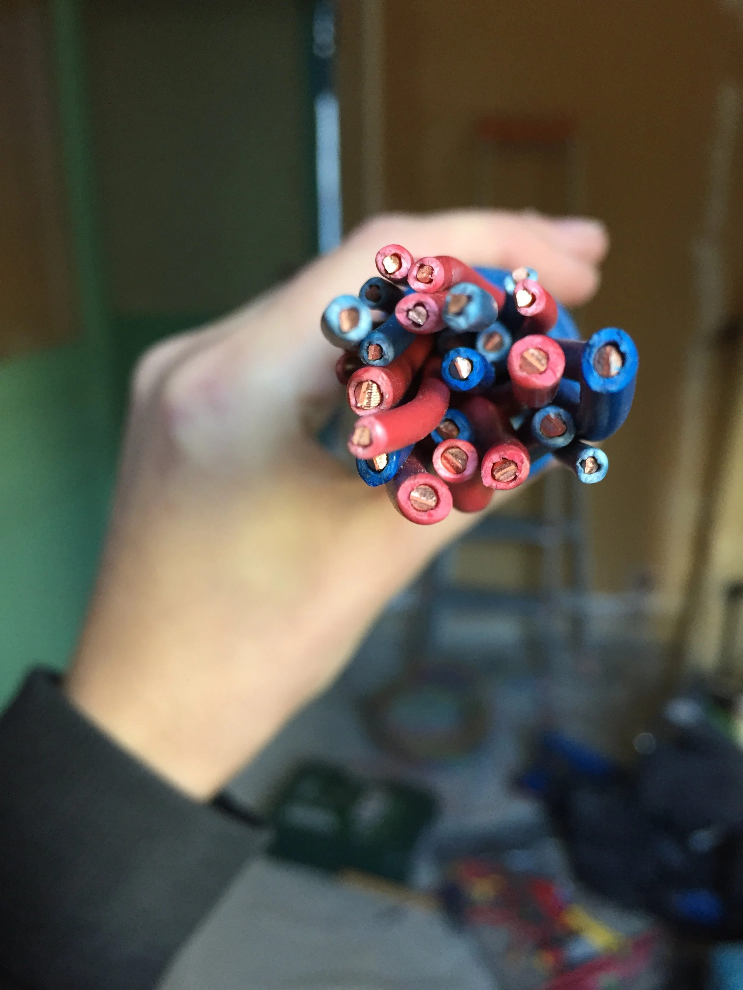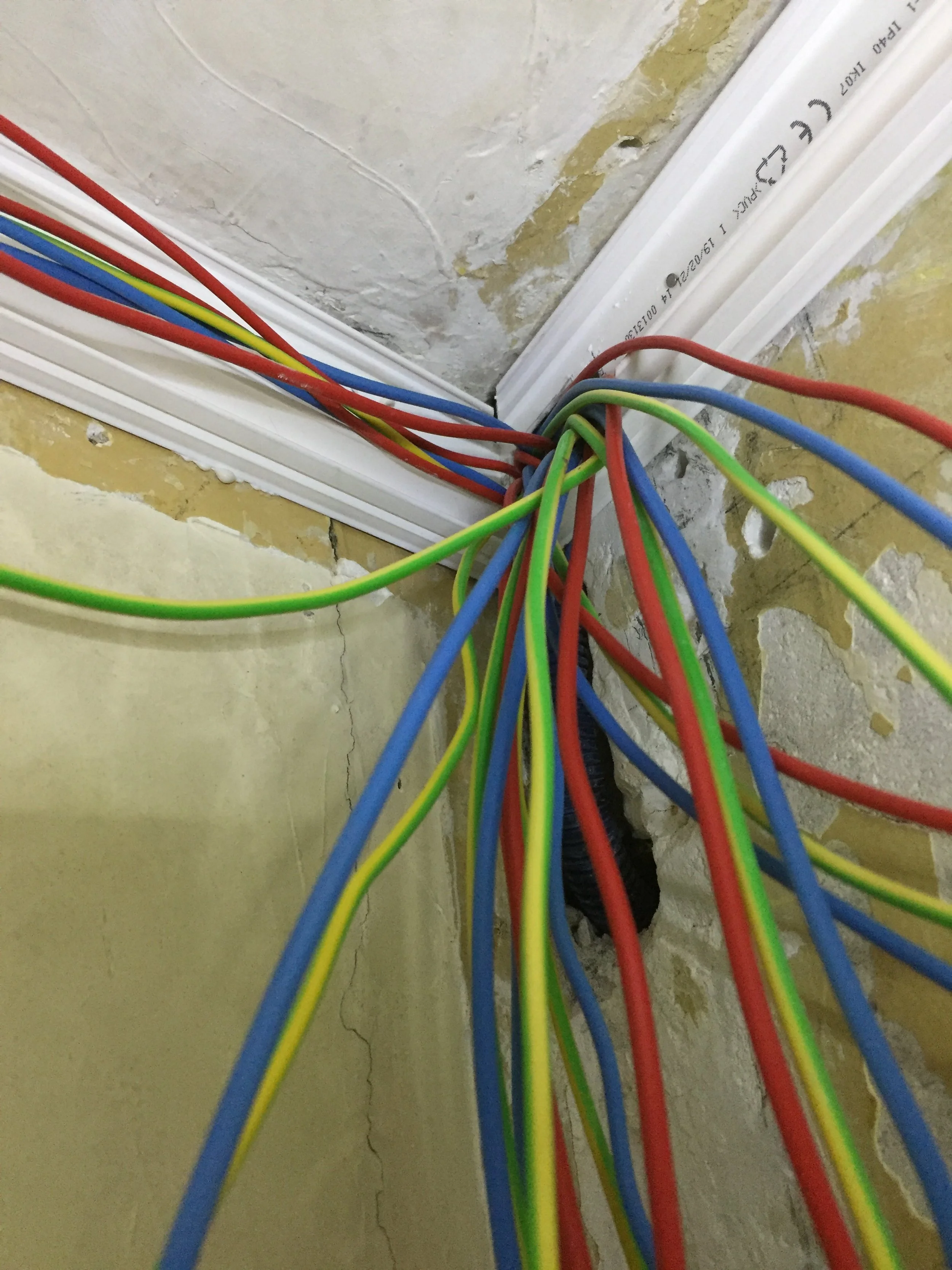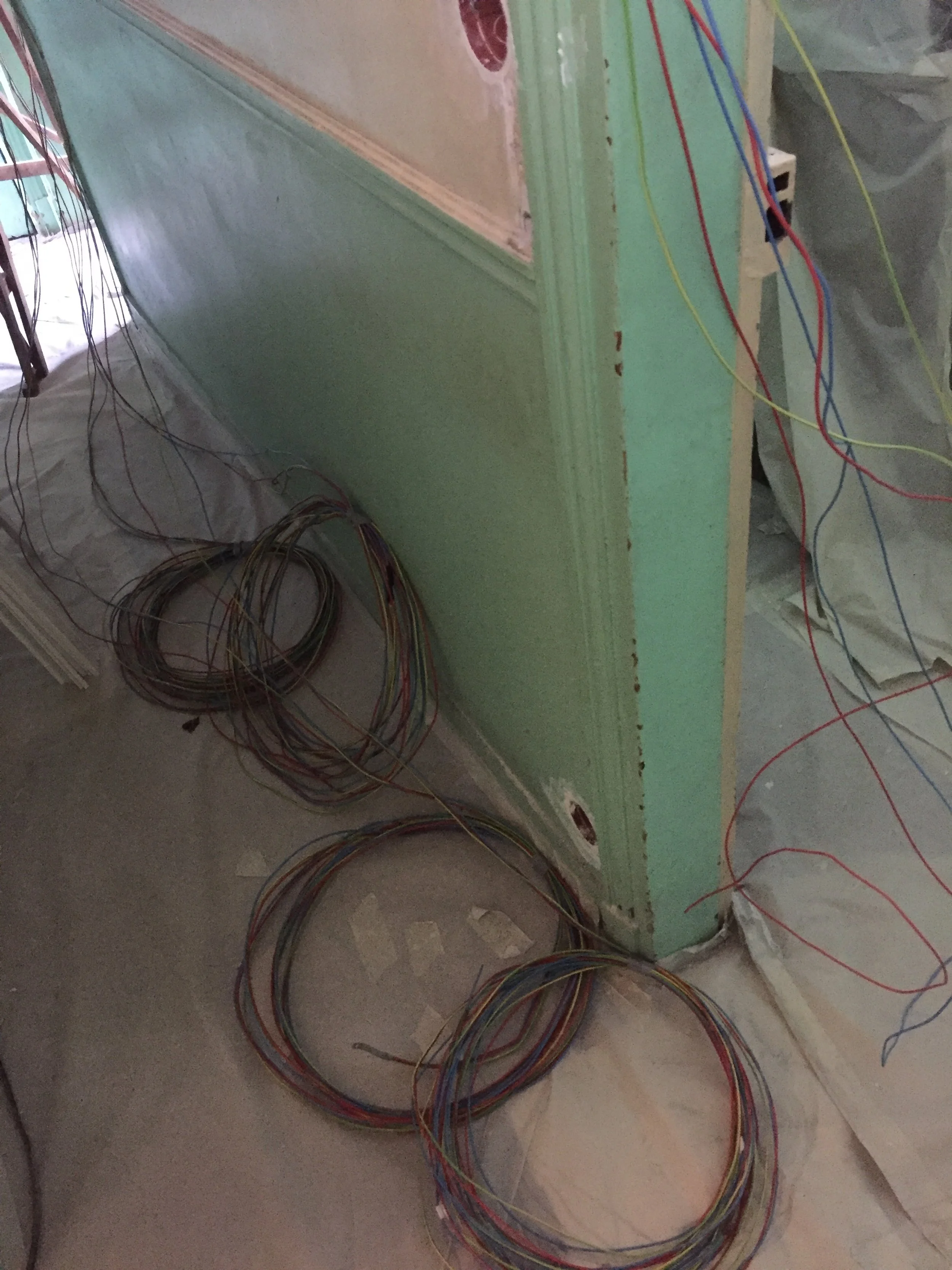 Des fils prêts à être répartis dans les moulures au plafond, janvier 2024