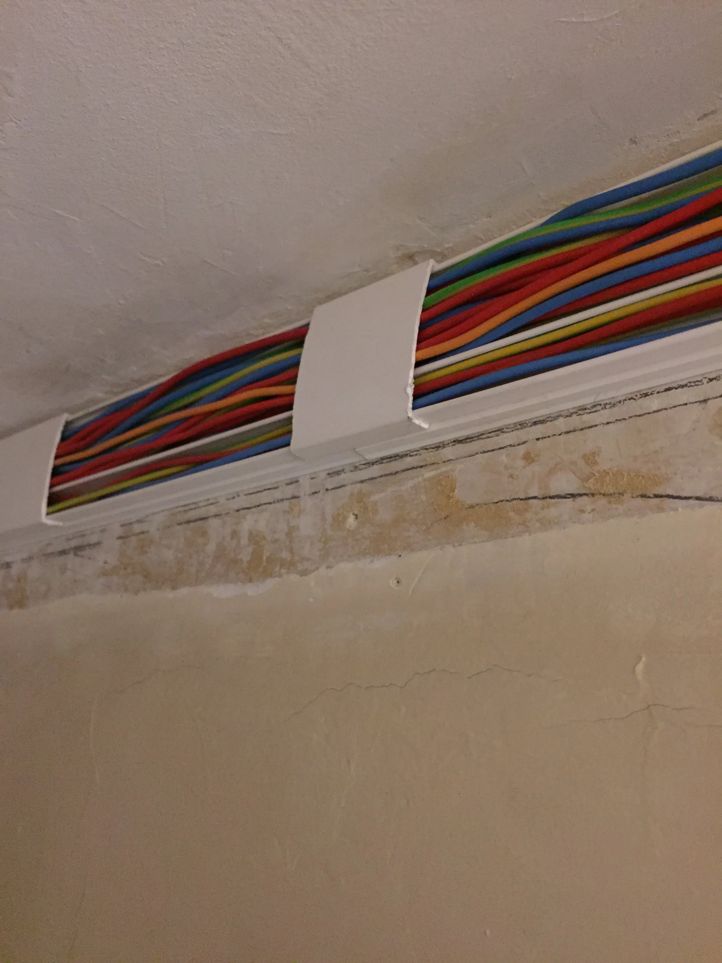 Des fils rangés dans une moulure au plafond, janvier 2024